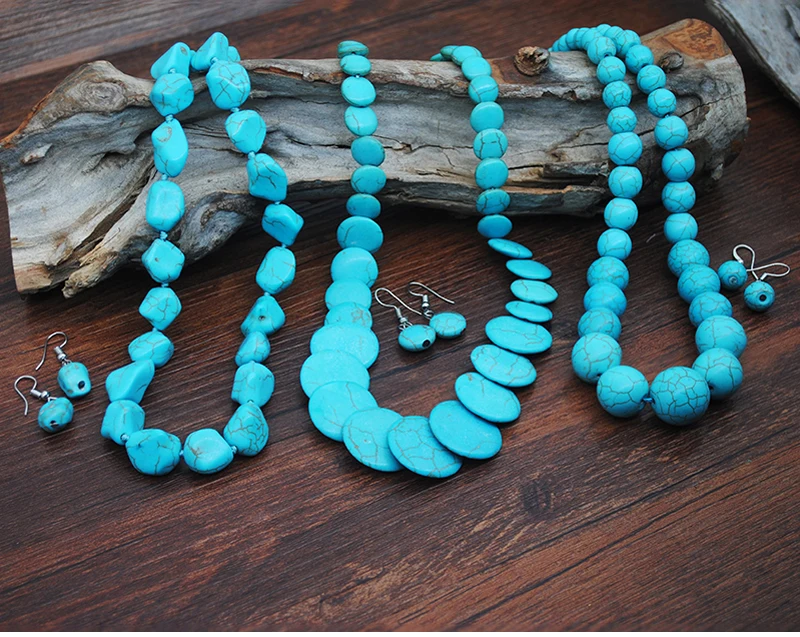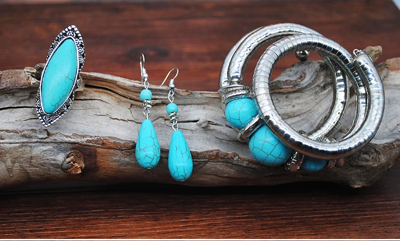 Fashion Turquoise Jewelry Set Vintage Silver Plated Natural Stone Earrings Necklace Bracelet Ring for Women